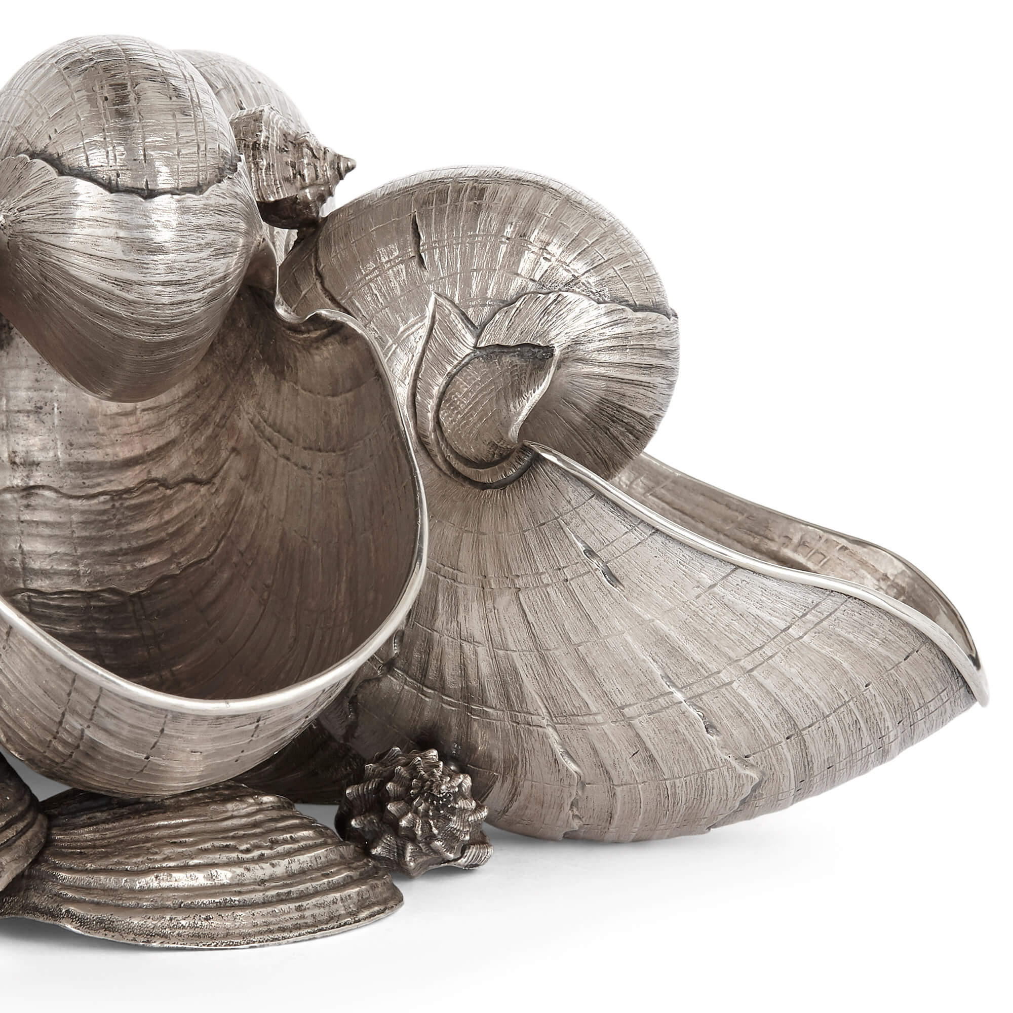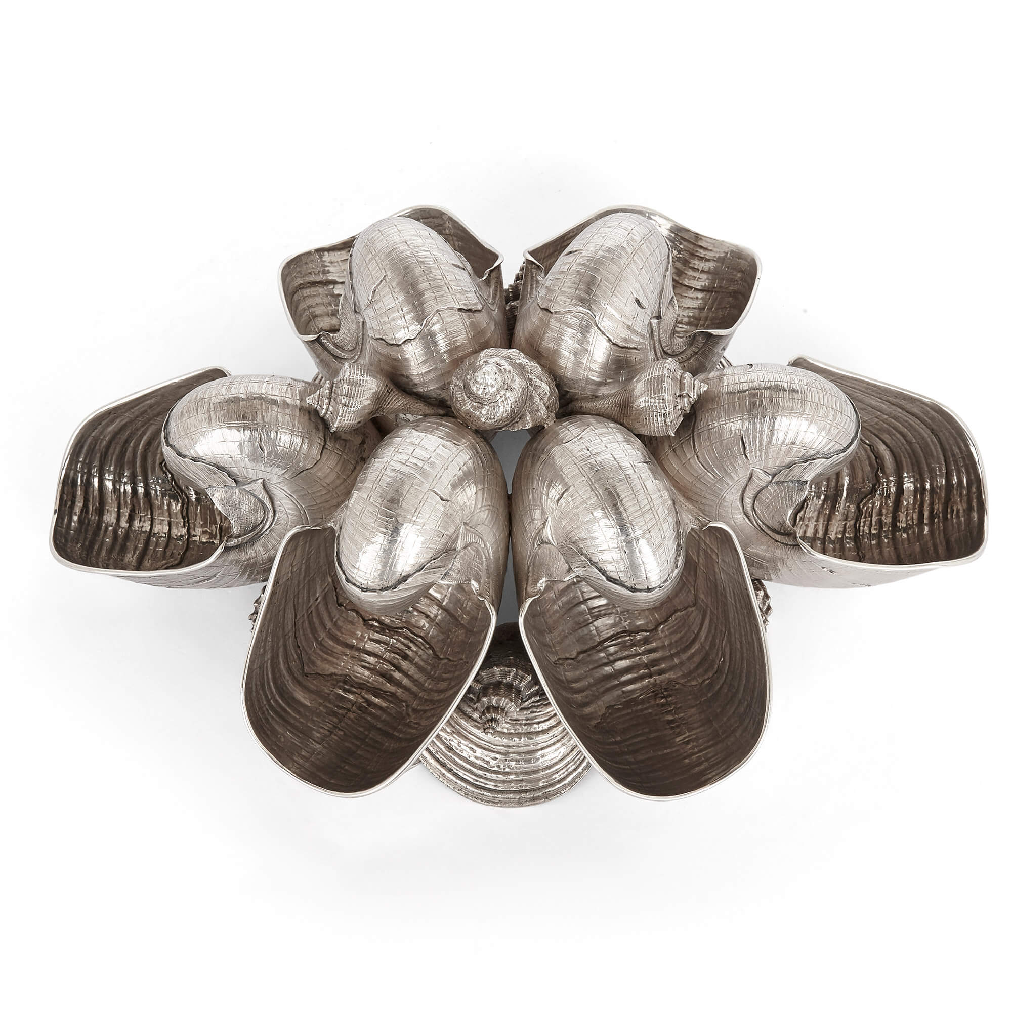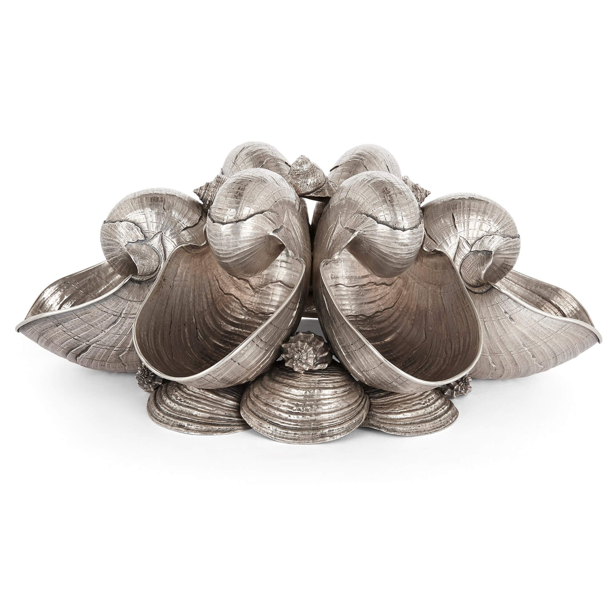 Dieses wunderschöne Tafelaufsatz aus Sterlingsilber stammt von der italienischen Silberschmiedin Pradella Ilario, die das Stück für die Mailänder Firma Buccellati geschaffen hat. Das als Nautilus bekannte Werk besteht aus sechs silbernen Nautilusmuscheln, die zwischen verschiedenen Muscheln platziert und auf einem Sockel aus Muschelschalen erhöht sind. Die Muscheln sind wunderbar verarbeitet und weisen jeweils vollkommen plausible naturalistische Details auf.