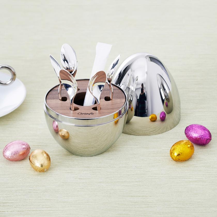 In der Mitte des Tisches platziert ist das Design-Ei mit dem hochwertigem Besteckinhalt von Christofle ein echter Hingucker. Es wird sicher verpackt in einer hochwertigen Geschenkbox von Christofle geliefert und ist eine wunderbare Geschenkidee.