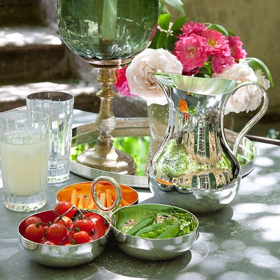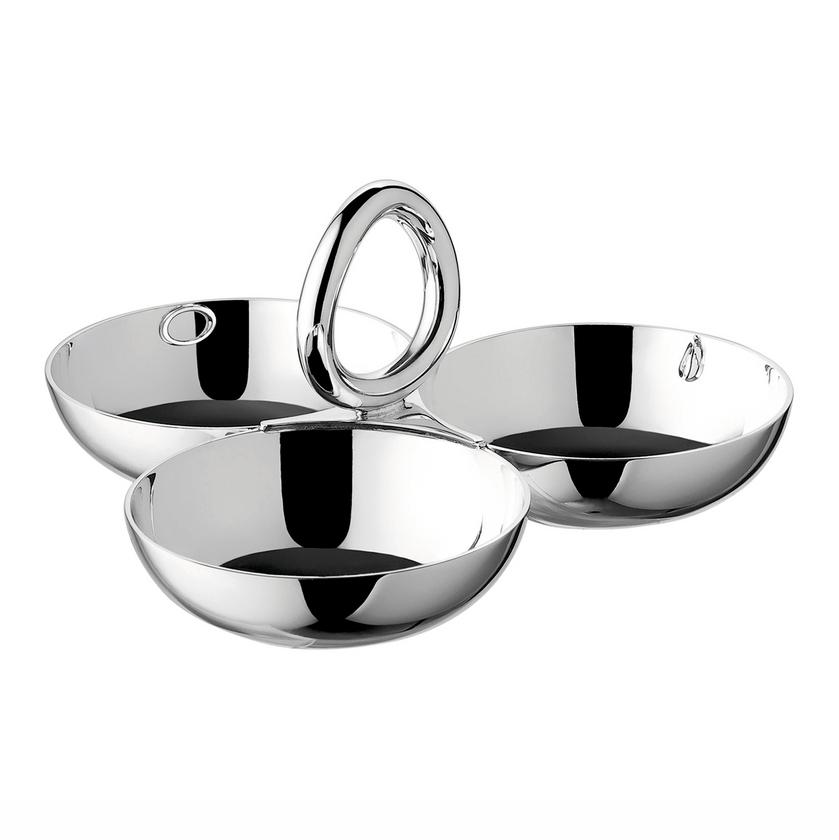Platz für dreierlei Knabbereien bieten die versilberten Schälchen aus der Serie “Vertigo” von Christofle.
