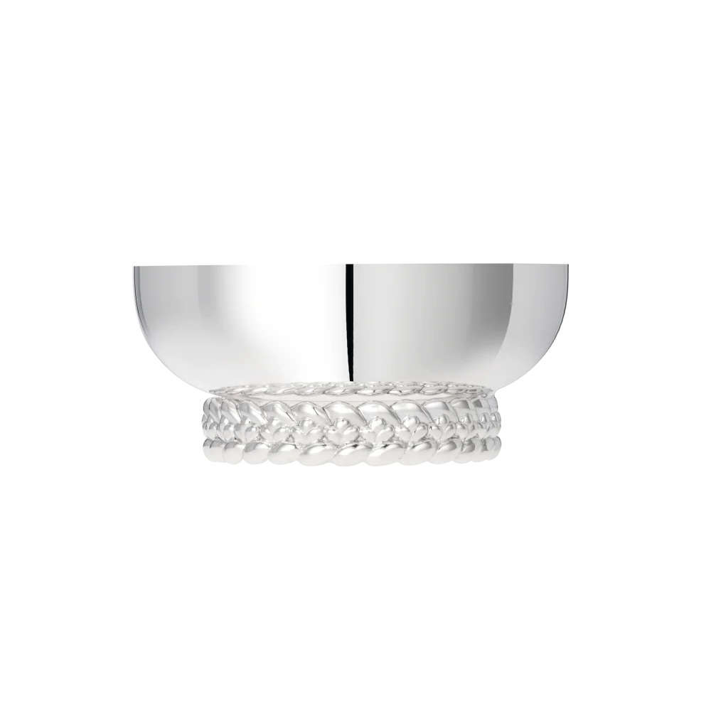 Eine versilberte Schale auf einem runden, geflochtenen Sockel ist vielseitig verwendbar: Sie kann Süßigkeiten oder Obst enthalten, als Aperitifschale dienen oder auch als hübsches Dekorationsobjekt.