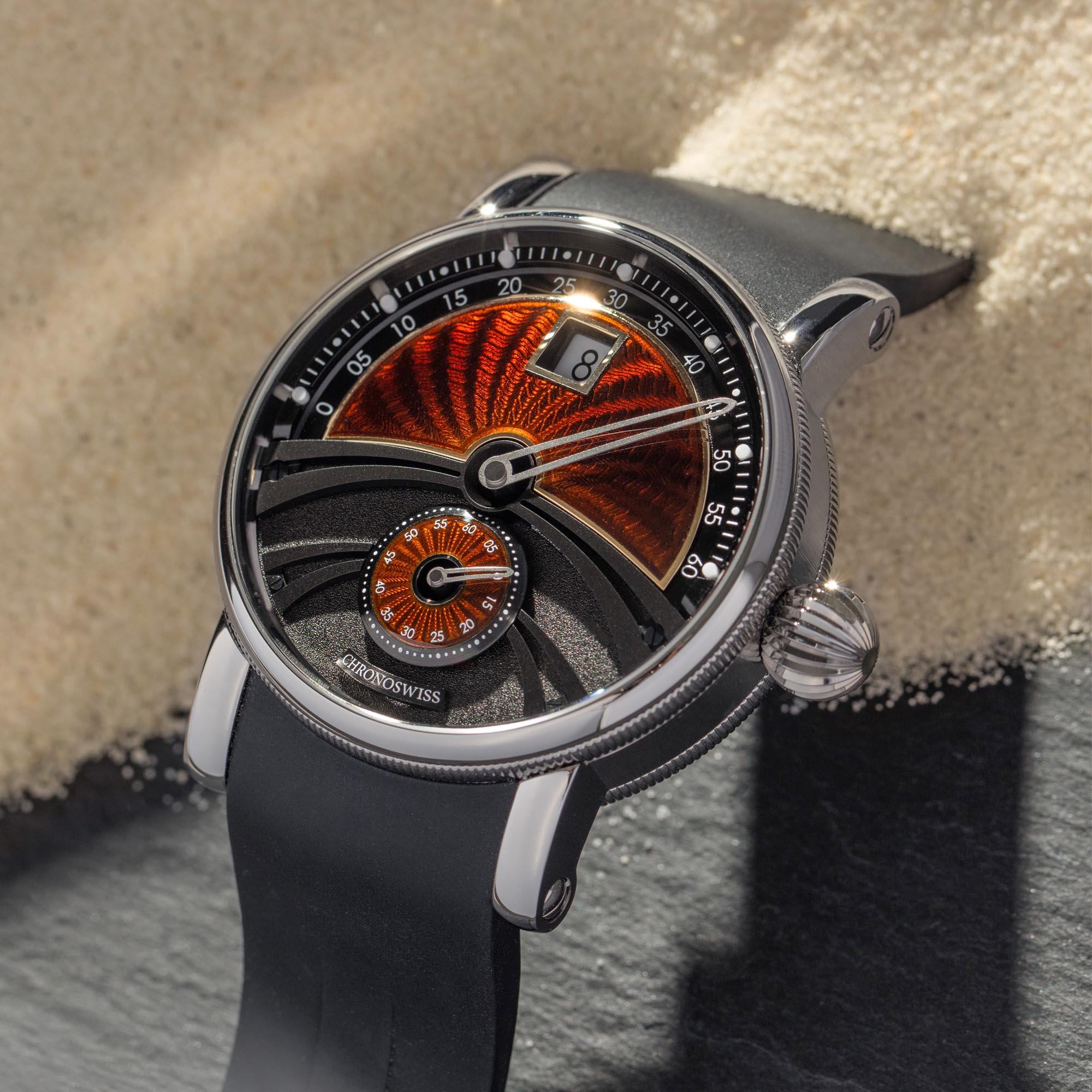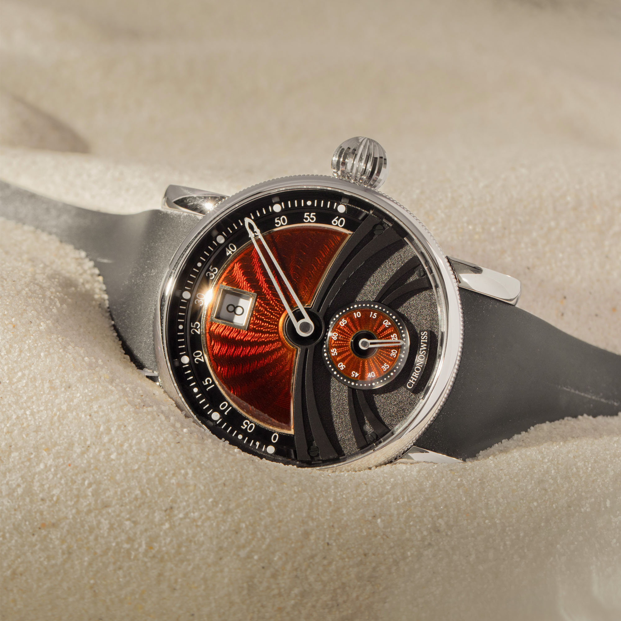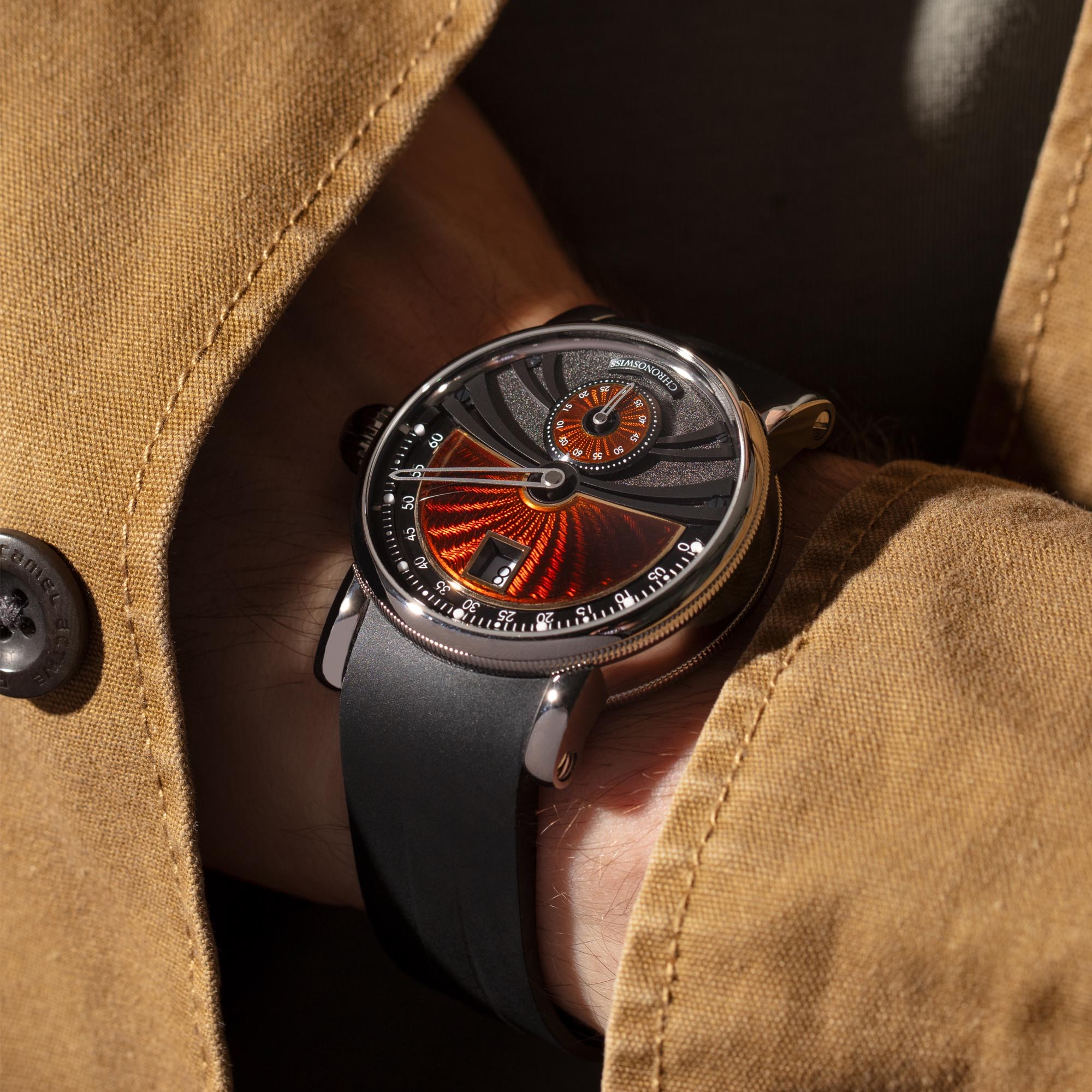 Chronoswiss mit Sitz in Luzern stellt seit seiner Gründung 1983 ausschliesslich mechanische Uhren her. Spezialisiert hat sich dieser unabhängige Hersteller auf sog. Regulatoren, d.h. Uhren mit dezentraler Anzeige von Stunden, Minuten und Sekunden. Zudem werden meistens guillochierte Zifferblätter aus Sterlingsilber 925 versende, die diesen Uhren ihren unverwechselbaren Charme geben.