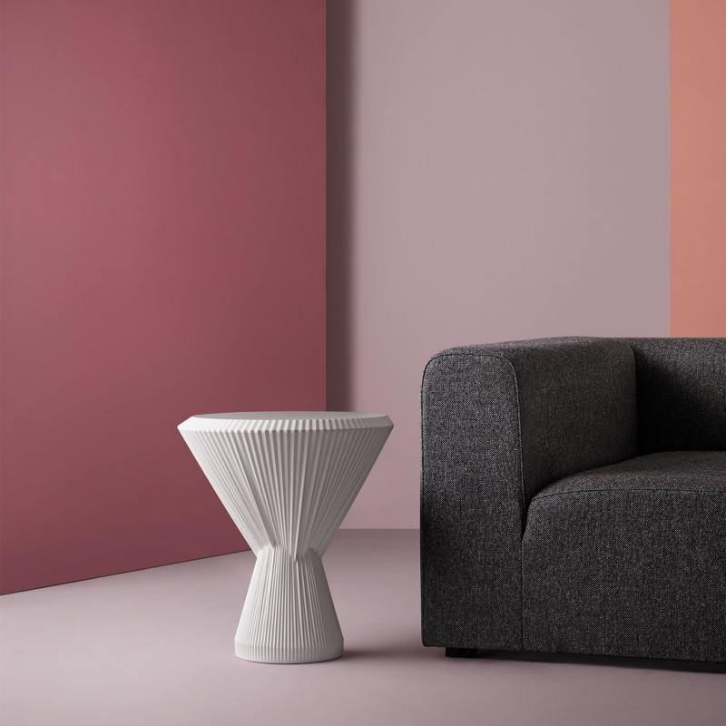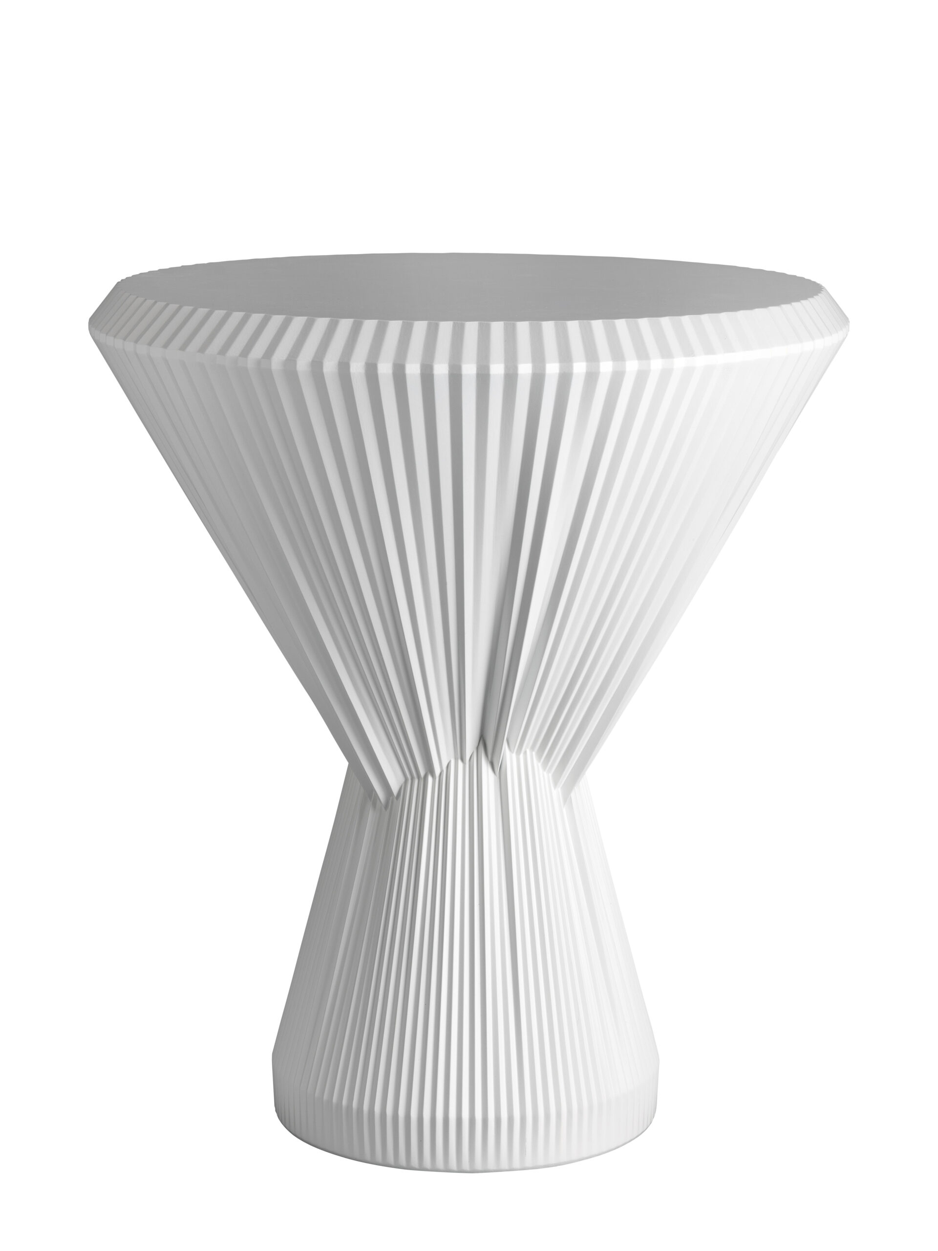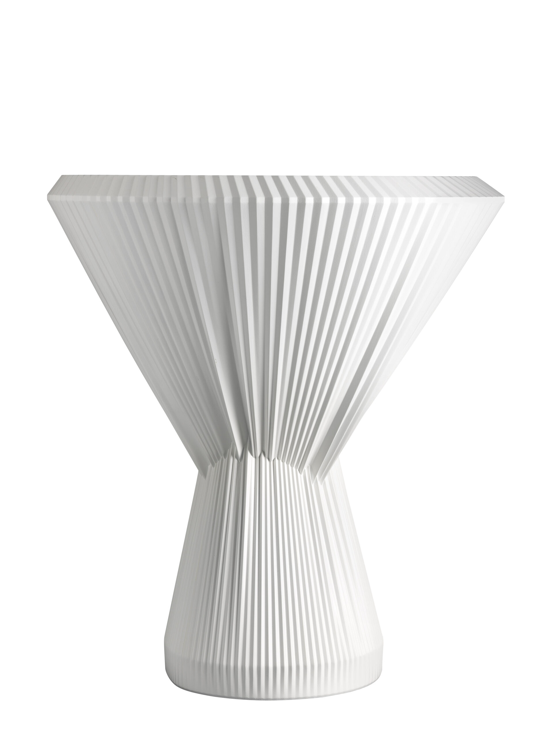 PLISAGO bringt die Eleganz und Raffinesse von Porzellan in moderne Wohnwelten. Zwei ineinanderreifende Kegel bilden die Grundform des Beistelltischs, dessen Fertigung größte Präzision in der Herstellung erfordert, da er vollständig aus Porzellan gefertigt wird. Das interdisziplinäre Designduo Eva Marguerre und Marcel Besau kreierten im Auftrag von FÜRSTENBERG einen Tisch, dessen raffinierte Plissee-Optik durch ein Zusammenspiel von digital generierten Strukturen und bewussten Gestaltungsentscheidungen entstand.