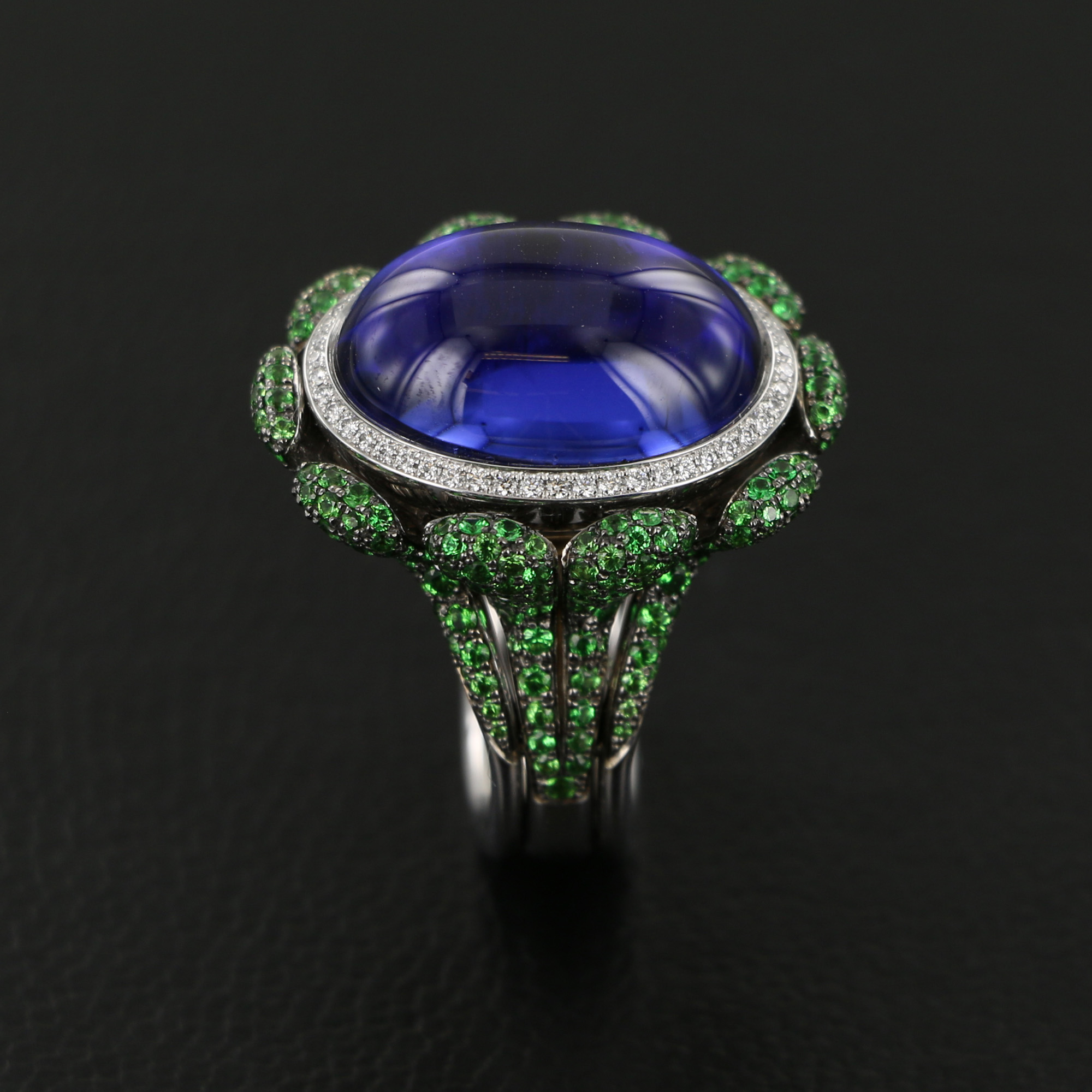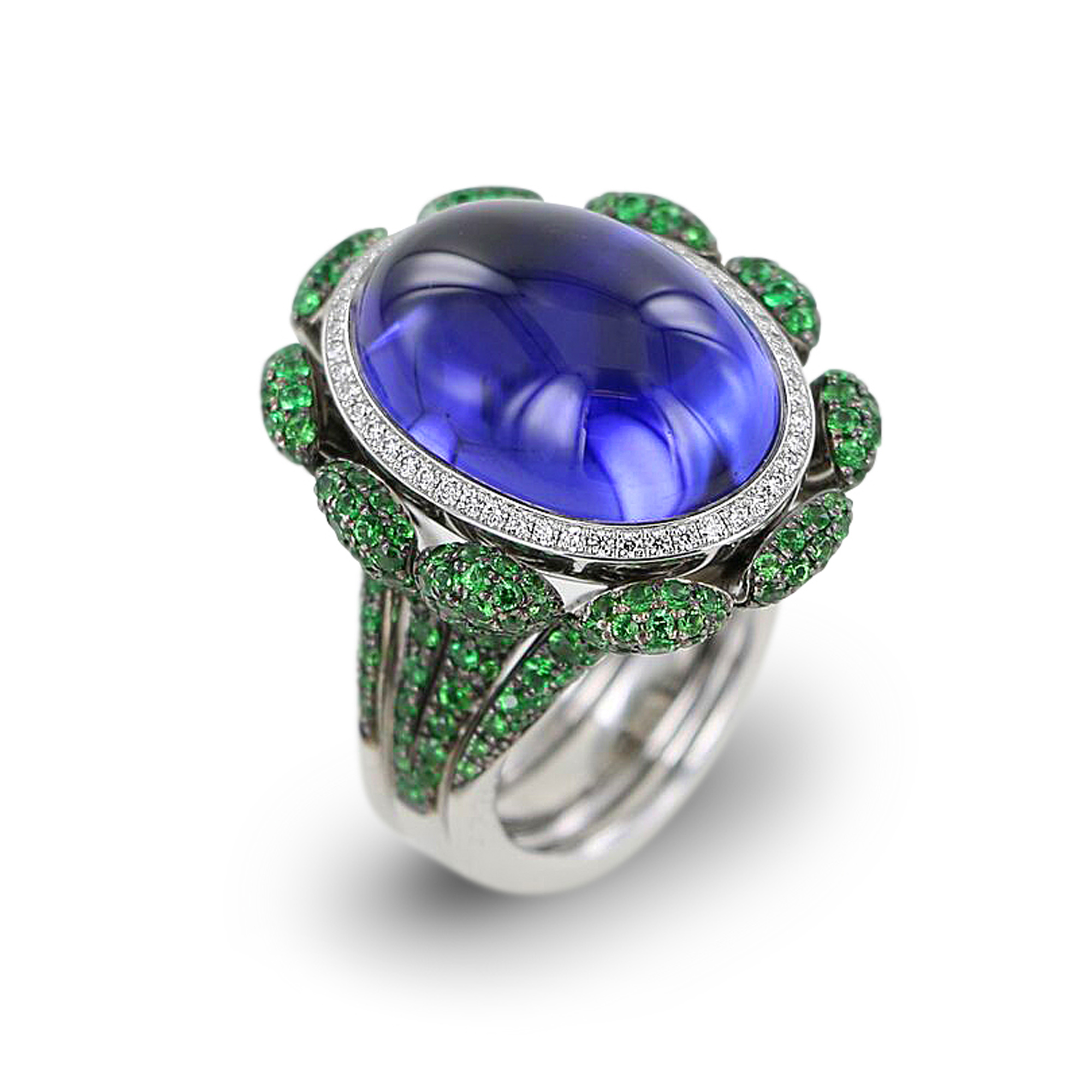 Der Ring, elegant, in organisch anmutender Form, geschmiedet und mit Edelsteinen gefasst im Goldschmiedeatelier, in leuchtendem Blau und Grün. Er besteht aus Weissgold 750. Ein Pavé mit 310 perfekt gefassten Tsavolithen überzieht ihn. Es schwingt sich von der Ringschiene hinauf, endend mit zehn blätterartigen Formen auf dem obersten Punkt. Und in der Mitte strahlt ein Tansanit-Cabochon. Er wird umrahmt mit Weissgold 750 und fünfzig Brillanten. Der Goldschmied und die Edelsteinfasserin leisteten filigrane, exakte, ganze Arbeit. Handwerkskunst und Präzision zeichnen sie aus. Sie verwenden stets die hochwertigsten Materialien und fertigen Unikate für die «Meister 1881 Collection».