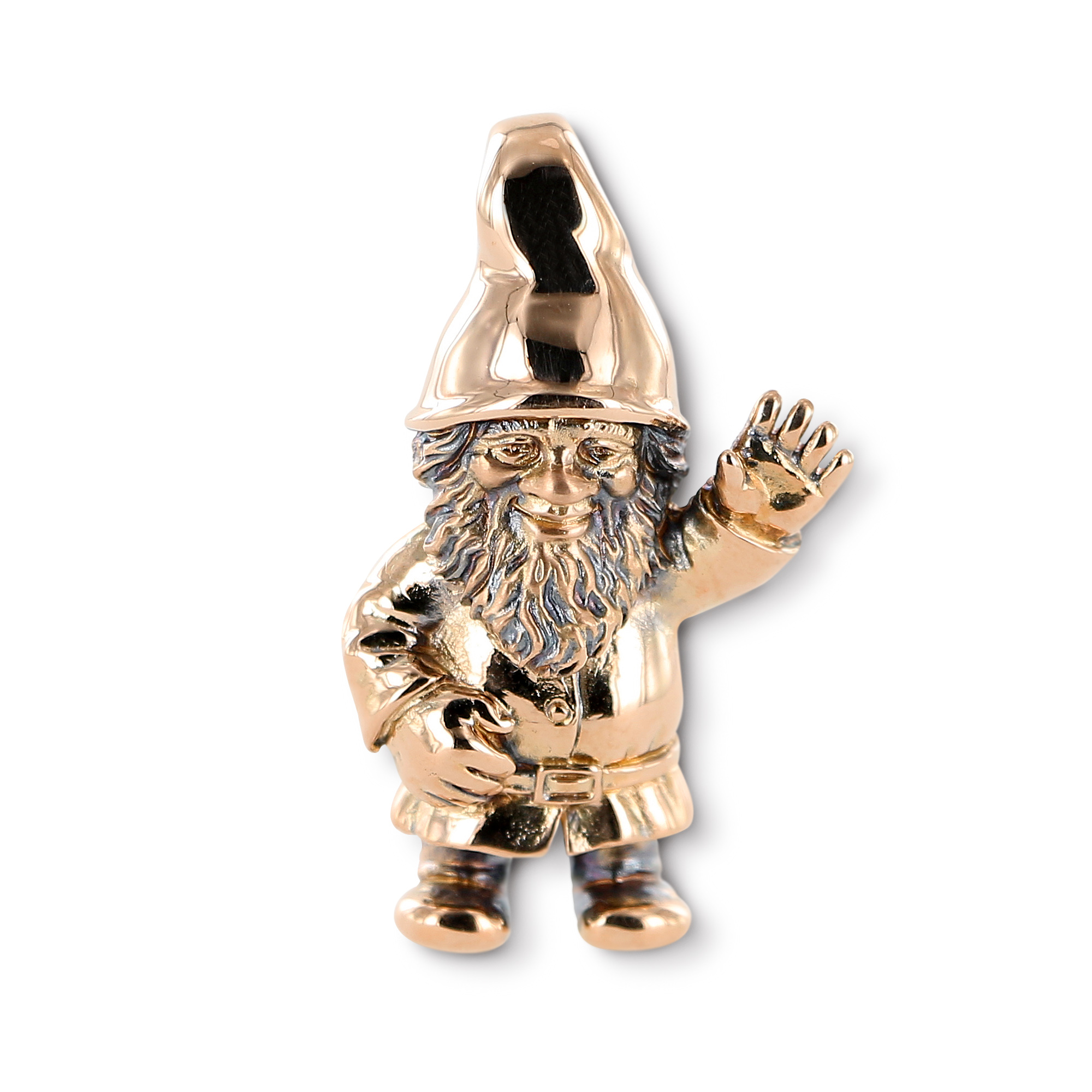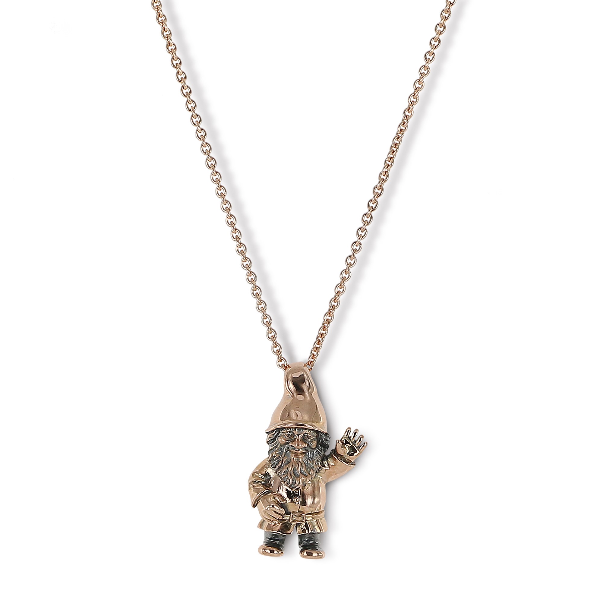 Ein klassischer Gartenzwerg als auffallender Anhänger. Erhältlich in Sterlingsilber, Gold sowie in einer mit Edelsteinen ausgefassten Variante.