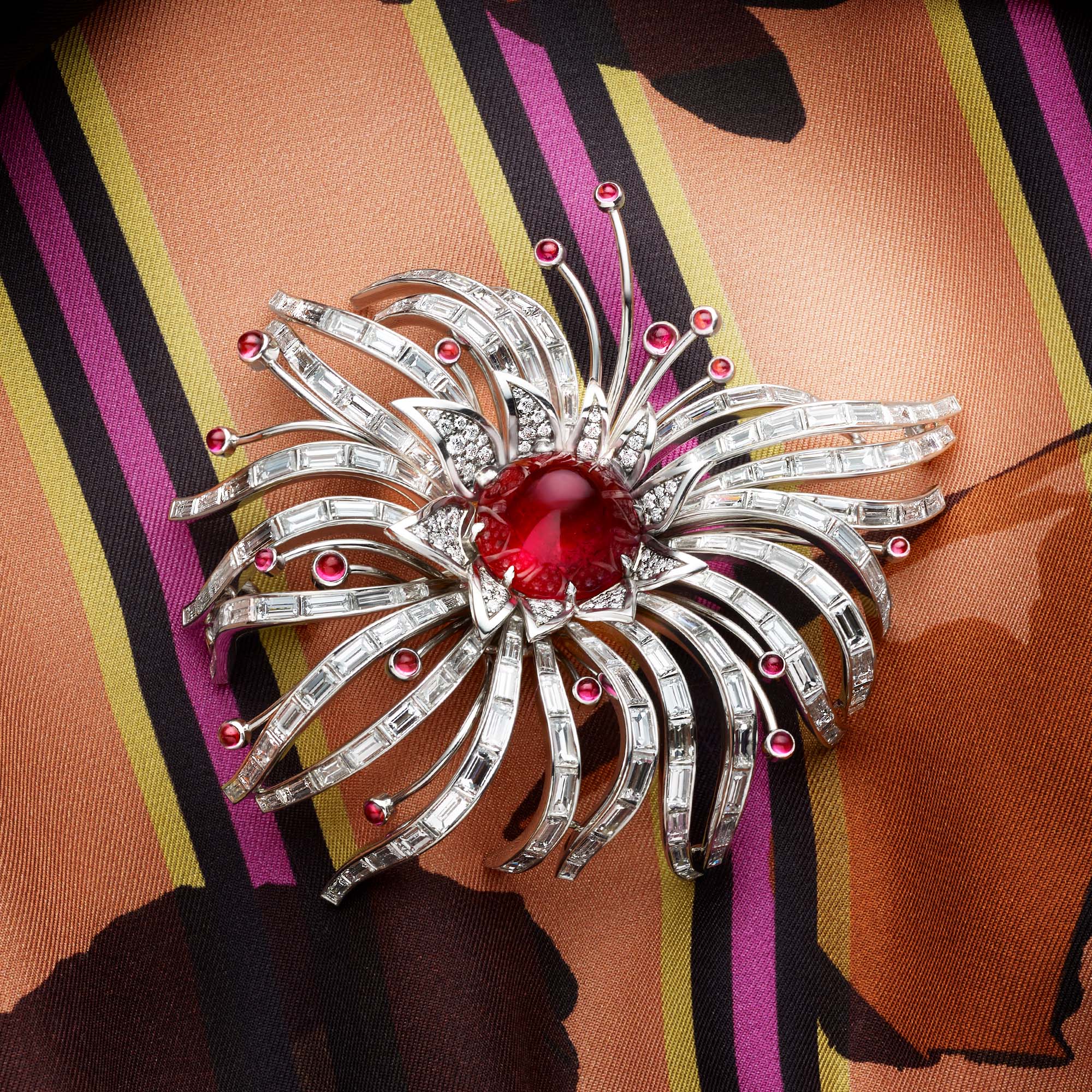 Die Blumenbrosche der «Meister 1881 Collection» mit einem Turmalin-Rubellit-Kegel 13.83 Carat ist ein Klassiker für Damen und verleiht jedem Auftritt Glanz und Glamour.