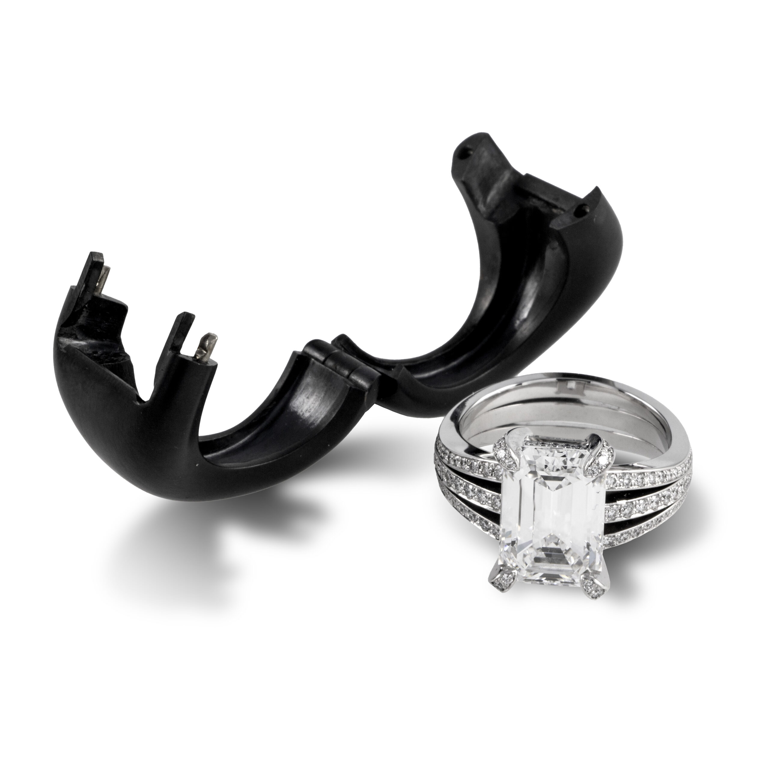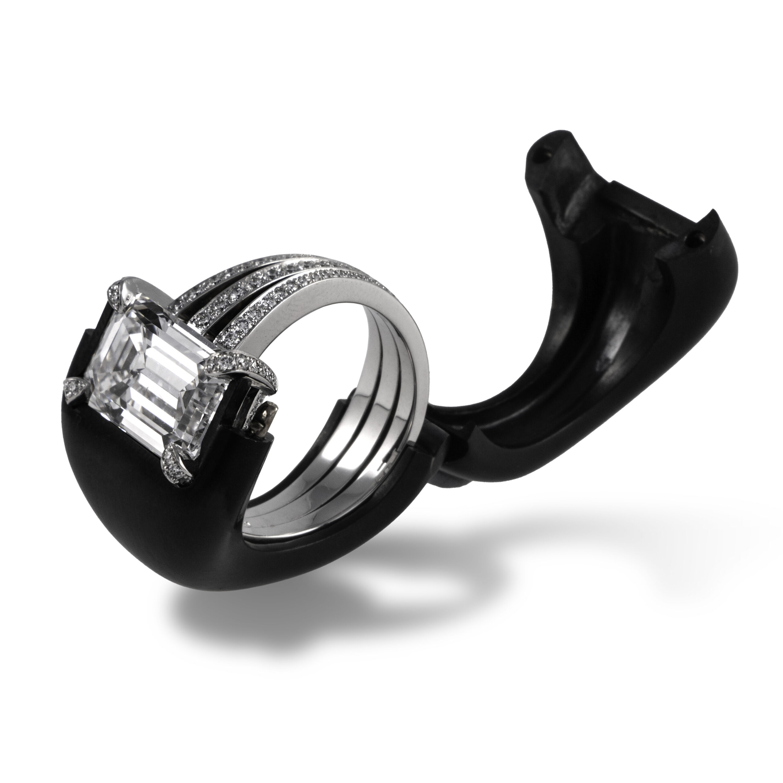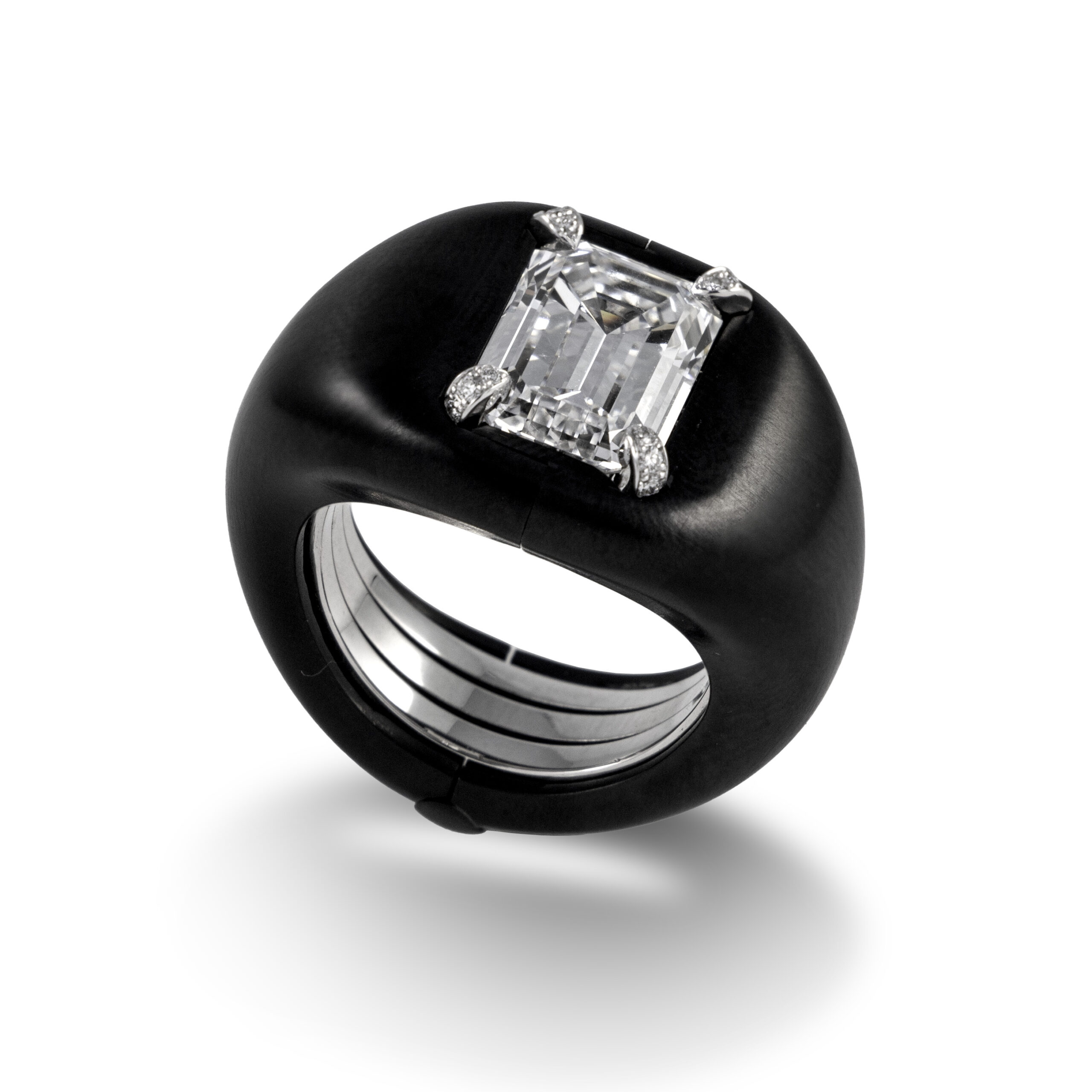 Der Ring ist vielseitig tragbar: Einzeln als Solitär oder mit brüniertem Eisenmantel.