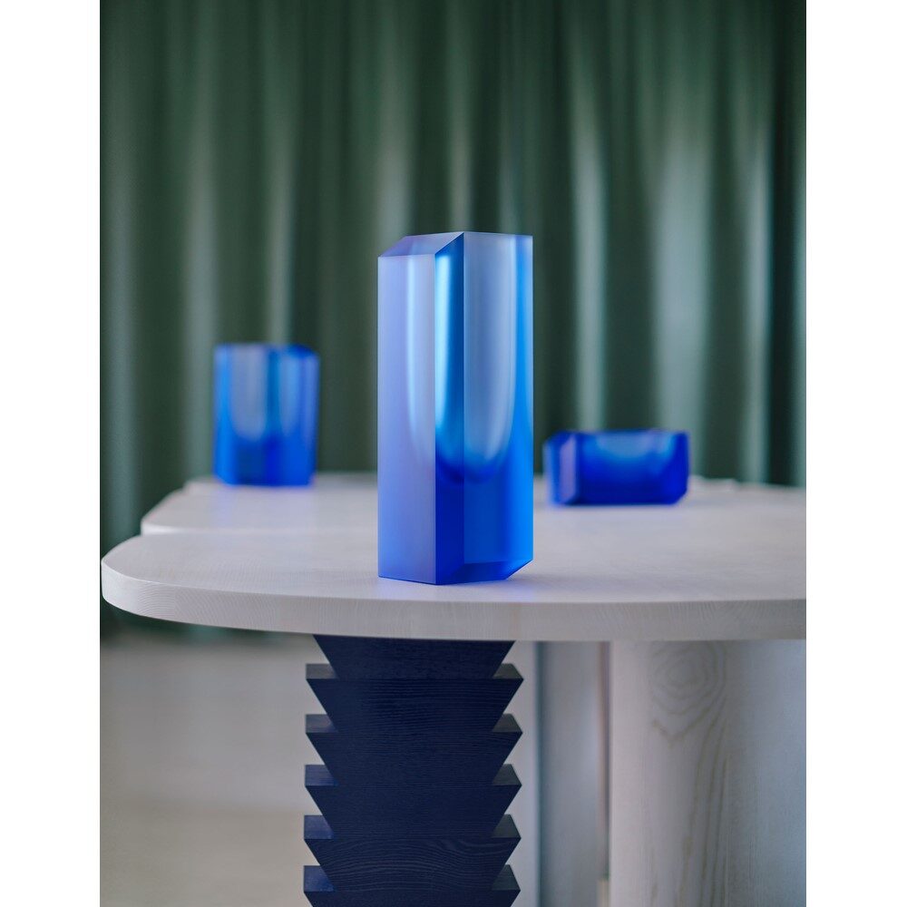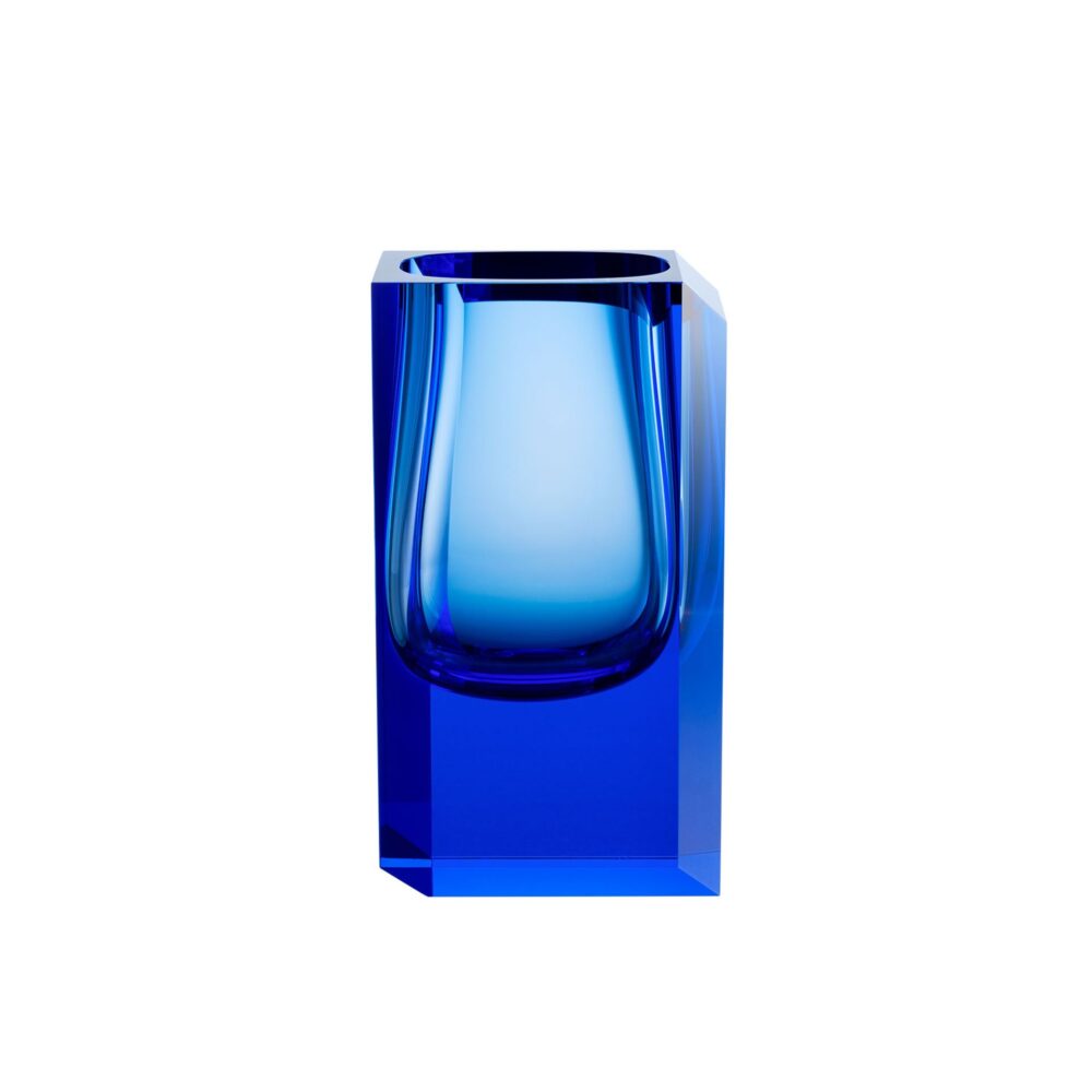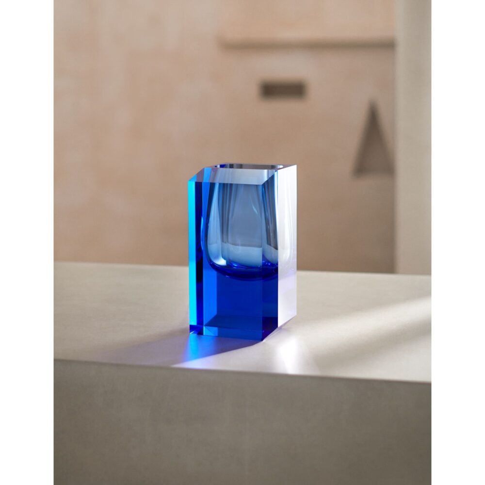 Eine geschliffene Vase aus glänzendem Kristall, als wäre sie direkt aus dem Eis gehauen. Der grünliche Ton am Boden geht allmählich in ein tiefes Blau über – wie wenn das geheimnisvolle Licht der Aurora Borealis den dunklen Nachthimmel durchdringt.