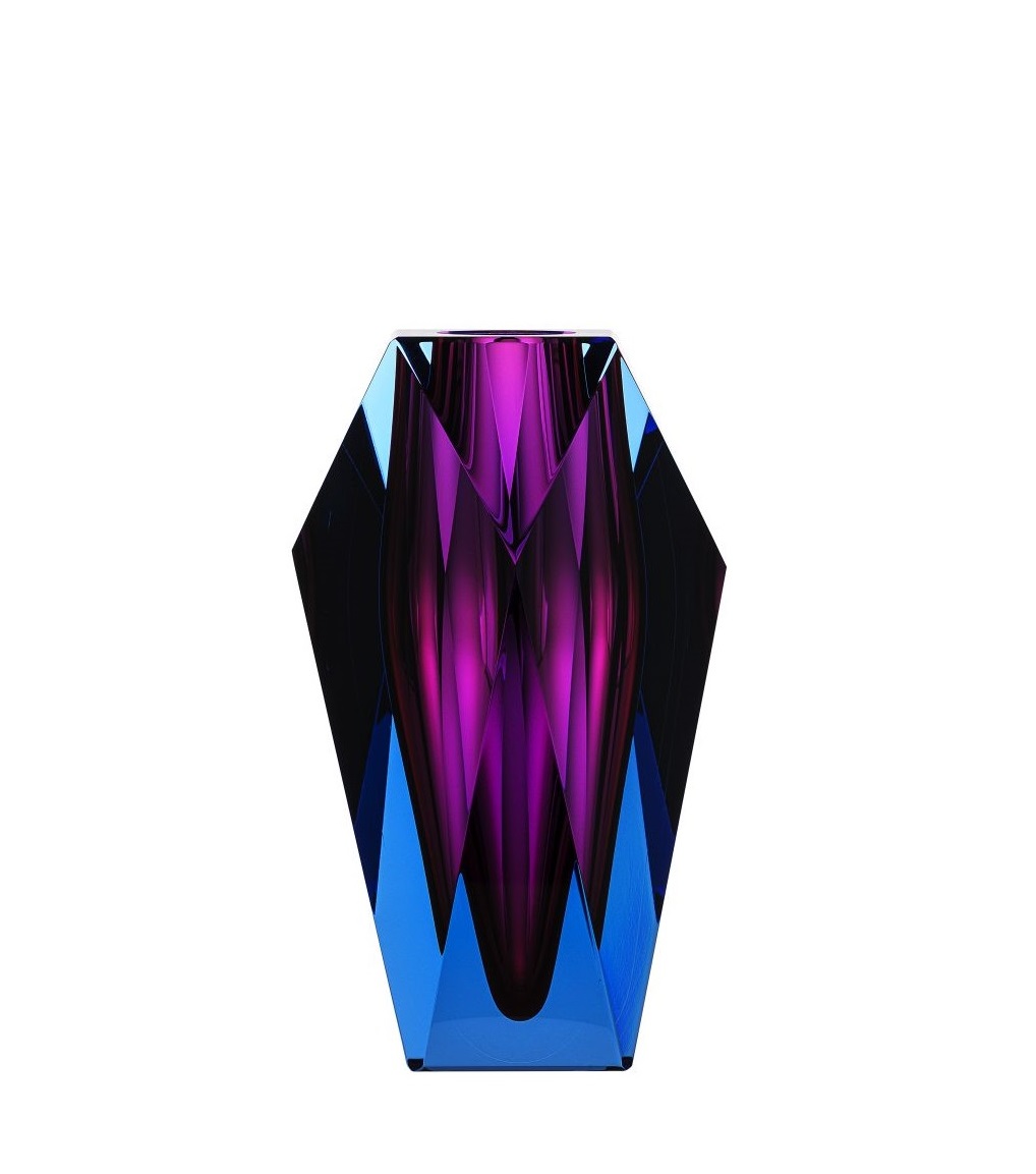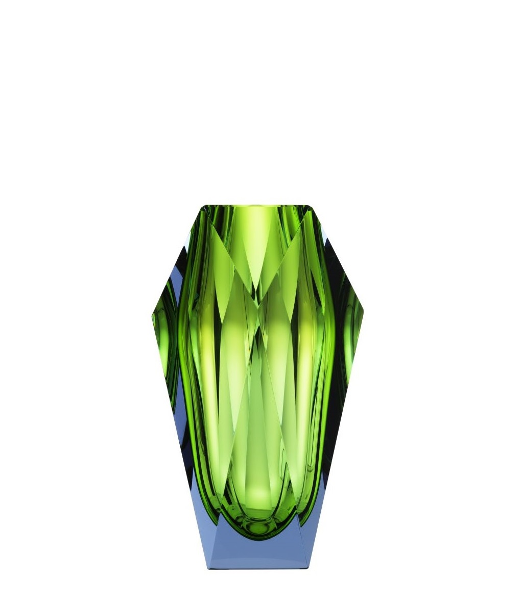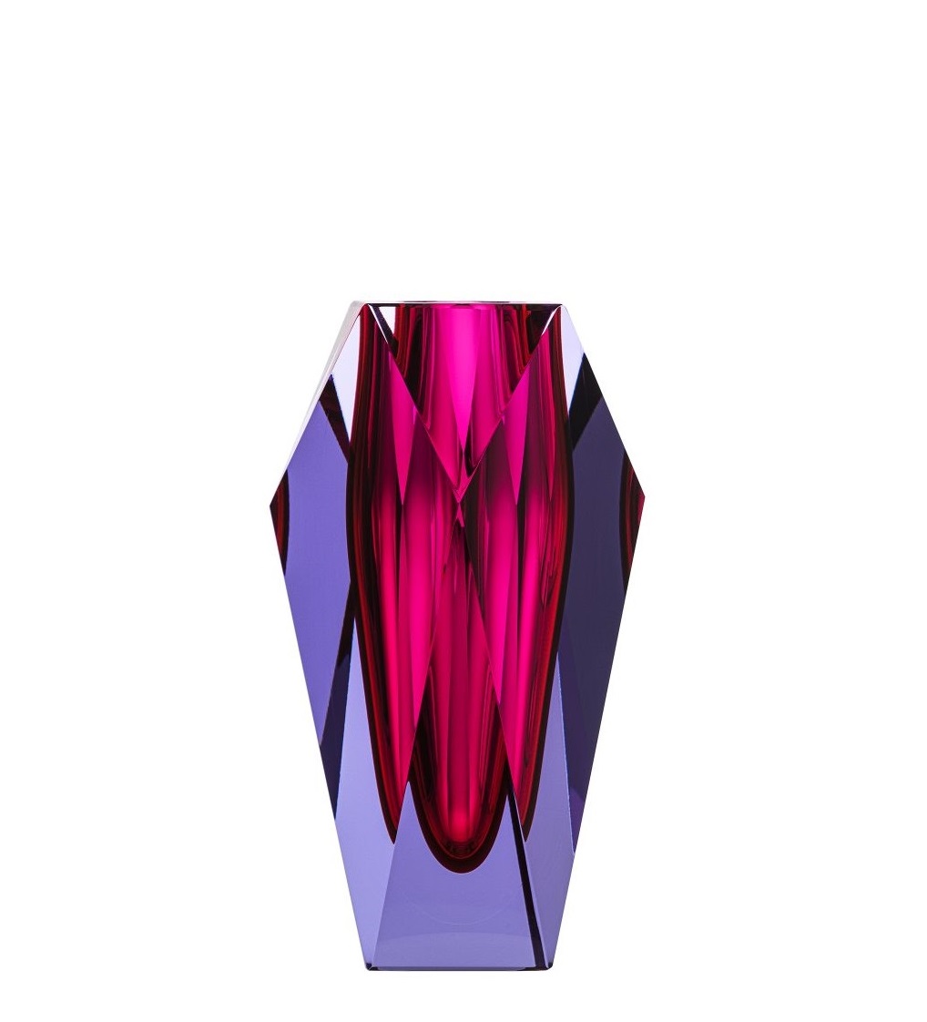 Die Vase “Gema” von Moser erinnert von ihrer Form an geschliffene Diamanten. Anders als bei Schmuck, braucht dieser “Diamant” aber keine Fassung und kann so rundherum bewundert werden. Vor allem spielt die Vase “Gema” von Moser aber mit einfallendem Licht: Lenkt es quer durch seine Doppelschicht hindurch, um die Farbpigmente irisieren zu lassen.