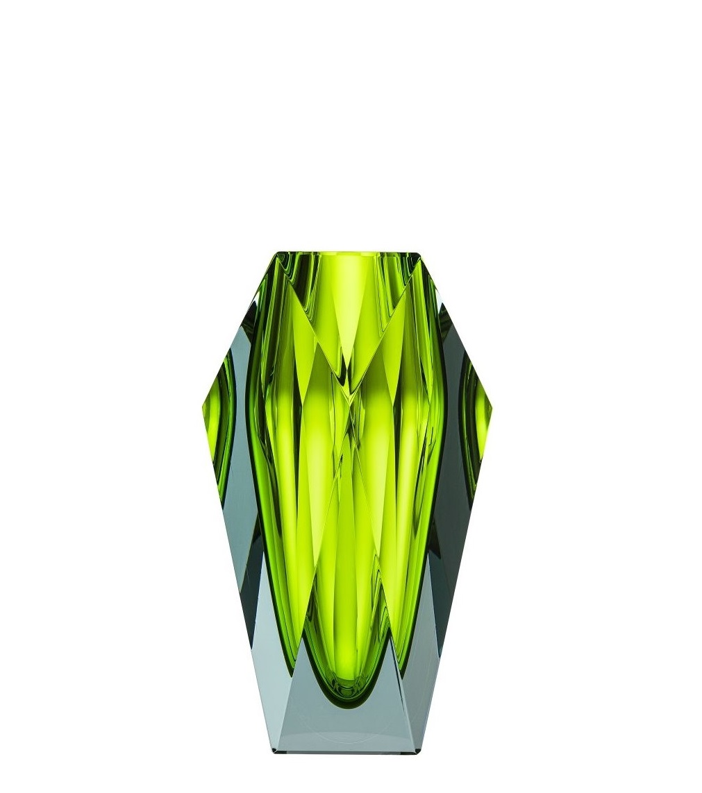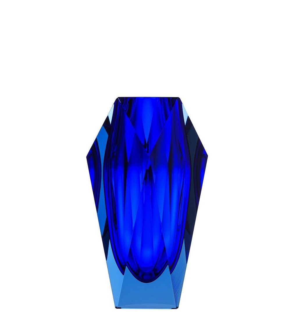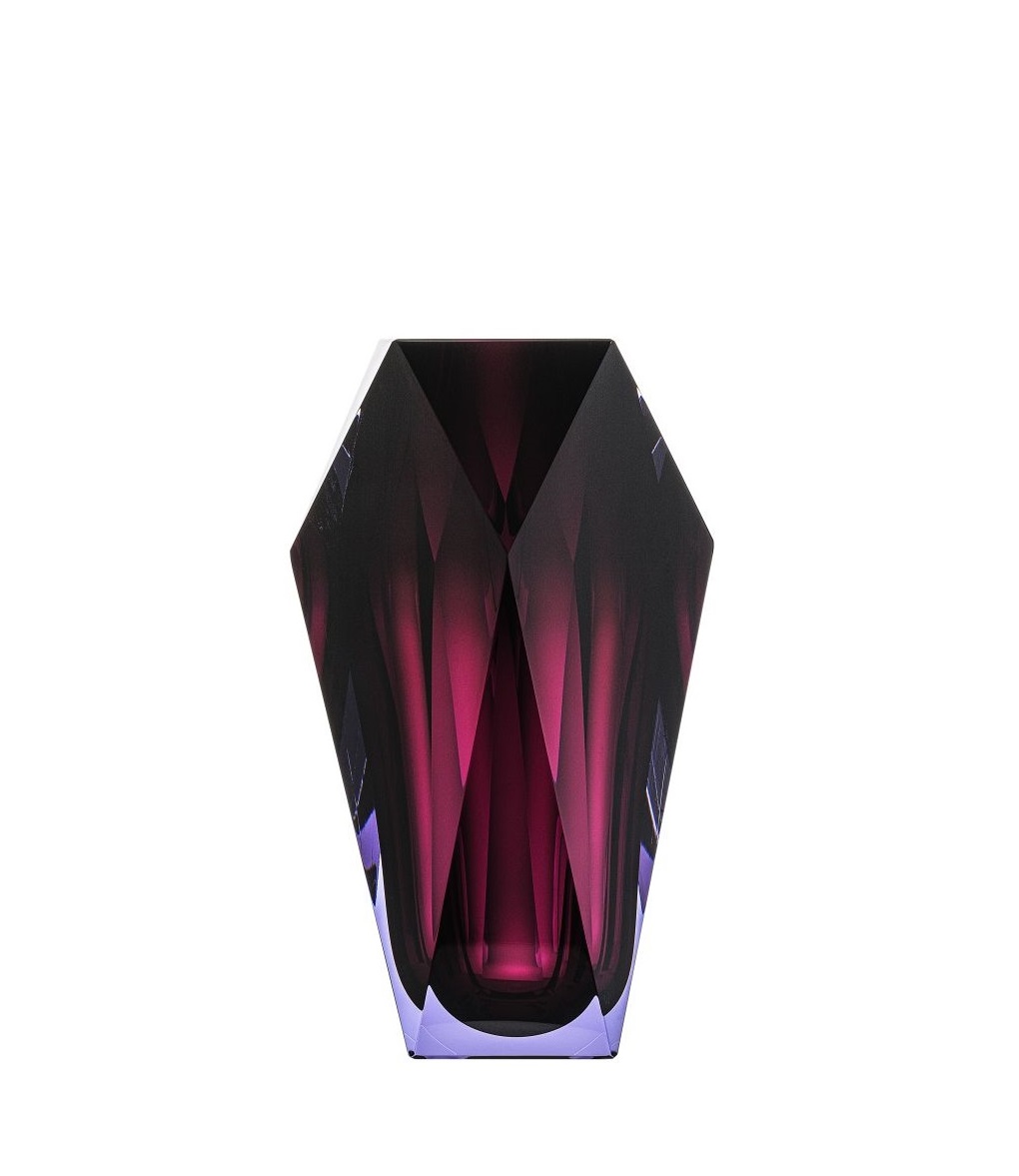 Die Vase “Gema” von Moser erinnert von ihrer Form an geschliffene Diamanten. Anders als bei Schmuck, braucht dieser “Diamant” aber keine Fassung und kann so rundherum bewundert werden. Vor allem spielt die Vase “Gema” von Moser aber mit einfallendem Licht: Lenkt es quer durch seine Doppelschicht hindurch, um die Farbpigmente irisieren zu lassen.