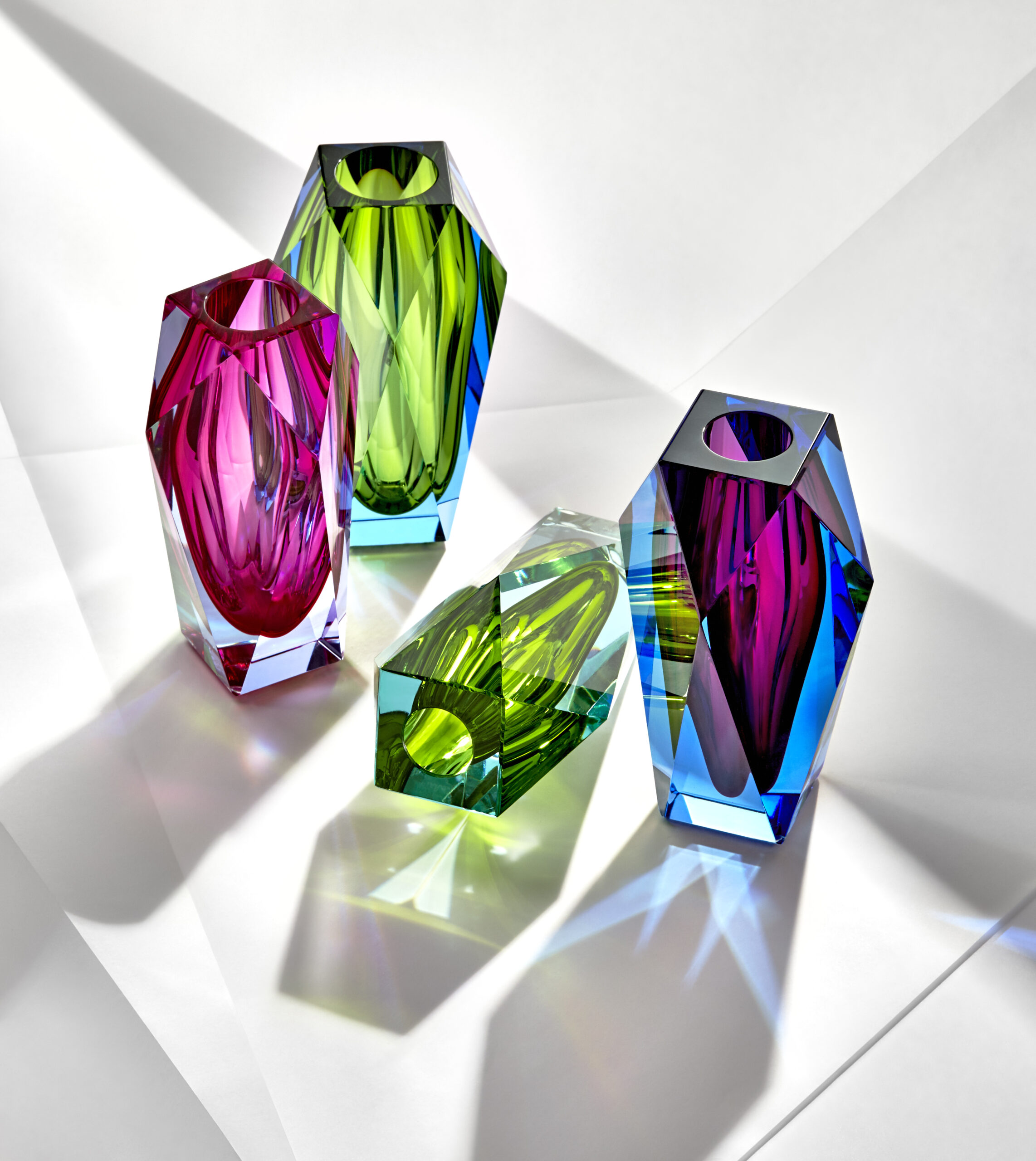 Das Besondere: Die Vasen “Gema” von Moser sind sogar zweifarbig. Dies wird möglich durch die sogenannte Unterfangtechnik, bei der eine farbige Glasschicht unter eine anders farbige Schicht eingesetzt wird.