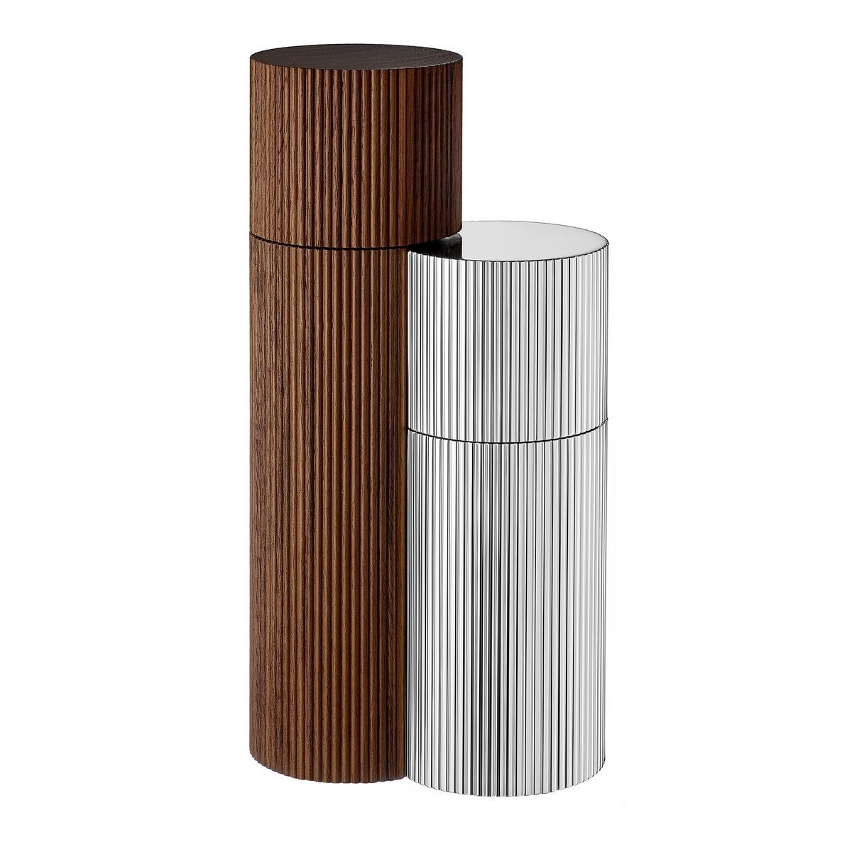 Küchenutensilien zum Vorzeigen. Die Mühlen “Granville” von Puiforcat sind dafür gestaltet, genutzt und gesehen zu werden. Das simple, architekturale Design von Grégoire de Lafforest ist eine perfekte Fortsetzung der Identität von Puiforcat. Die großen Mühlen bestehen aus versilbertem Messing und amerikanischem Walnussholz. Kannelierte Oberflächen verleihen ihnen die Eleganz antiker Säulen. Durch die unterschiedlich feine Kannelierung sind die Mühlen auf einen Blick leicht voneinander zu unterscheiden.