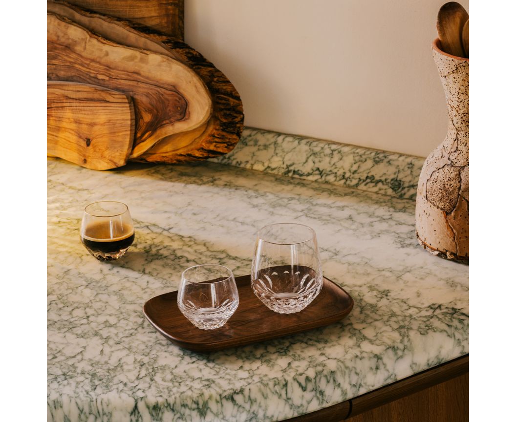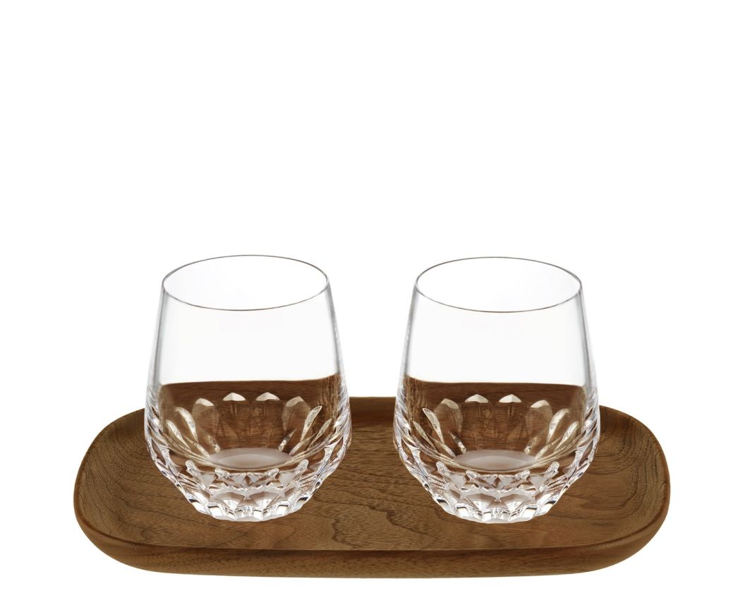 Inspiriert vom Design der Folia Becher mit ihren abgeschrägten Kanten. Das Duo aus 2 großen Kristallgläsern ist ideal, um einen doppelten Espresso oder einen langen Kaffee zu genießen. Die Unterseite der Kaffeegläser der Folia-Kollektion wird von Hand satiniert, um einen besseren Halt auf dem Holztablett zu gewährleisten. Zu den 2 Bechern gehört ein Holztablett. Da Holz ein lebendiges Material ist, ist jedes Tablett ein Unikat.