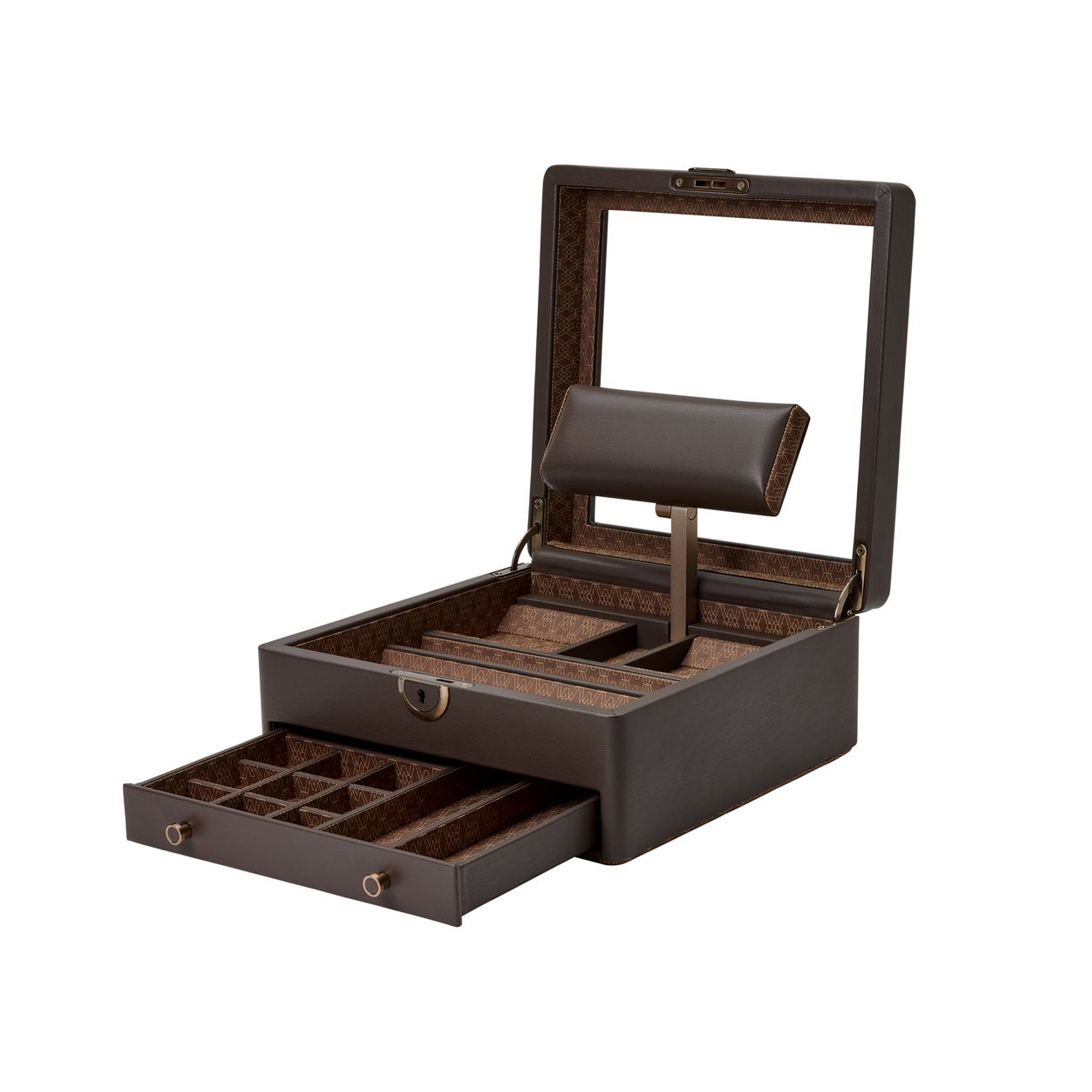 Die Geschichte von Wolf begann 1834 mit der Idee des visionären Gründers Philip Wolf, der es logisch fand, seine Besitze in hochwertigen Koffern zu schützen. Die Auswahl an Schmuckboxen und Reiseetuis bei Wolf ist gross. Gestepptes Leder, Samt, gestickte Applikationen oder Schubladen ermöglichen die stilvolle und sichere Aufbewahrung. Je nach Grösse beinhalten die Schatullen Schmuck- und Uhrenfächer, Ring- und Schmuckrollen, Ohrringlöcher, Kettenhalter und Ringleisten, zum Teil sind Reiseetuis – welche auch separat erhältlich sind – integriert.